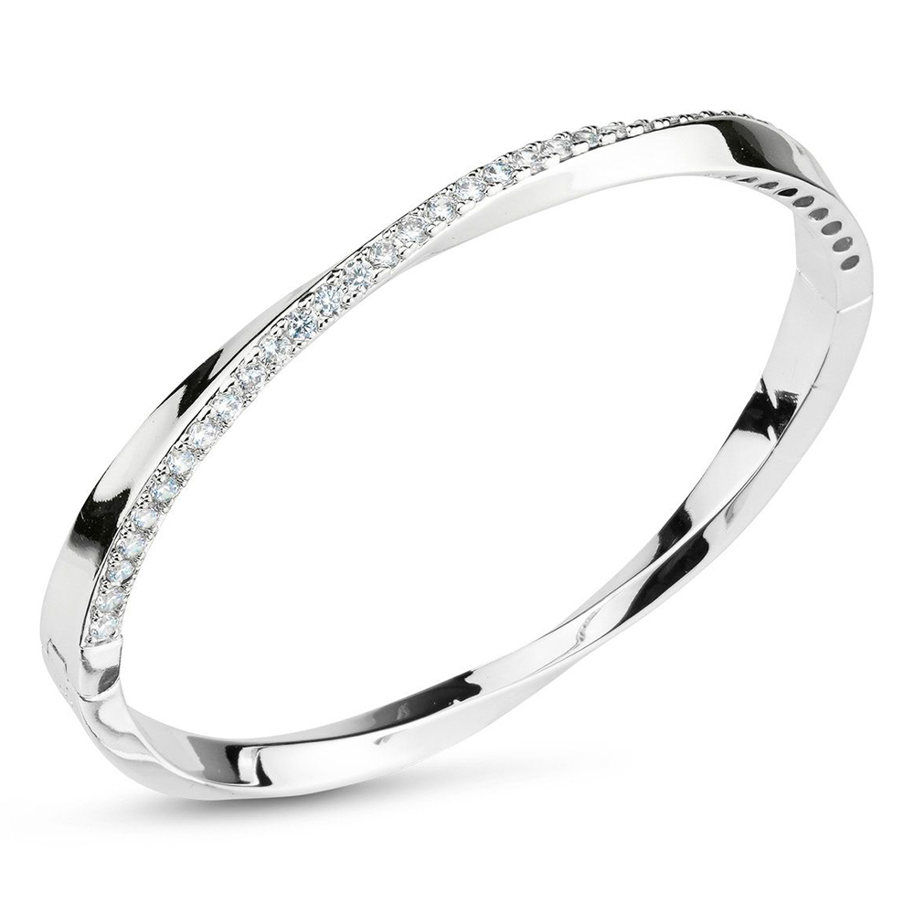 Размер изделия: 5,5 см Масса изделия: 22 г бронза, родиевое покрытие, кубический цирконий Жесткий браслет с родиевым покрытием и цирконием. Внутренний диаметр 5,5 см. Застежка пружинная.