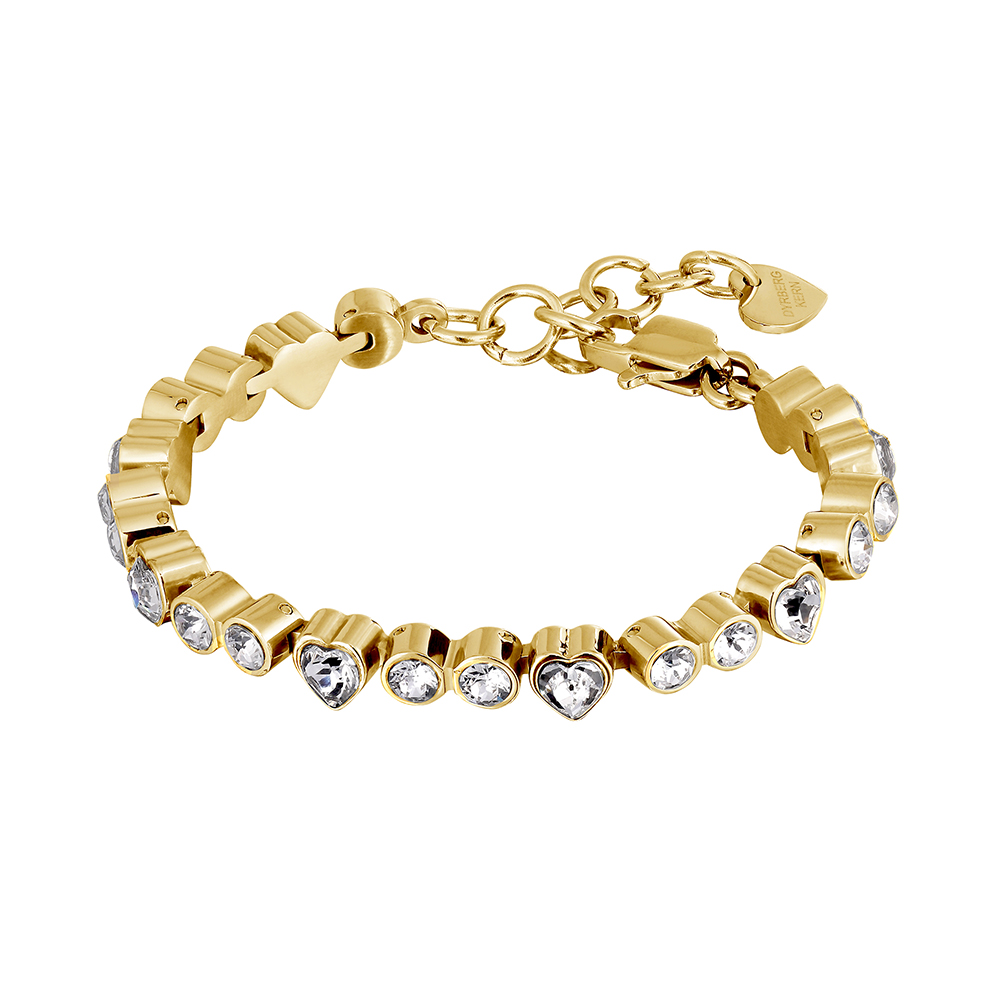 Размер изделия:17 + 3 см удлинитель Масса изделия: 23 г FURY - изящный теннисный браслет с кристаллами округлой огранки и в виде сердечек. Элегантный и игривый. Здесь представлен с классическими белым кристаллами на золотистой основе. Датский дизайн. Без никеля, кадмия и свинца.