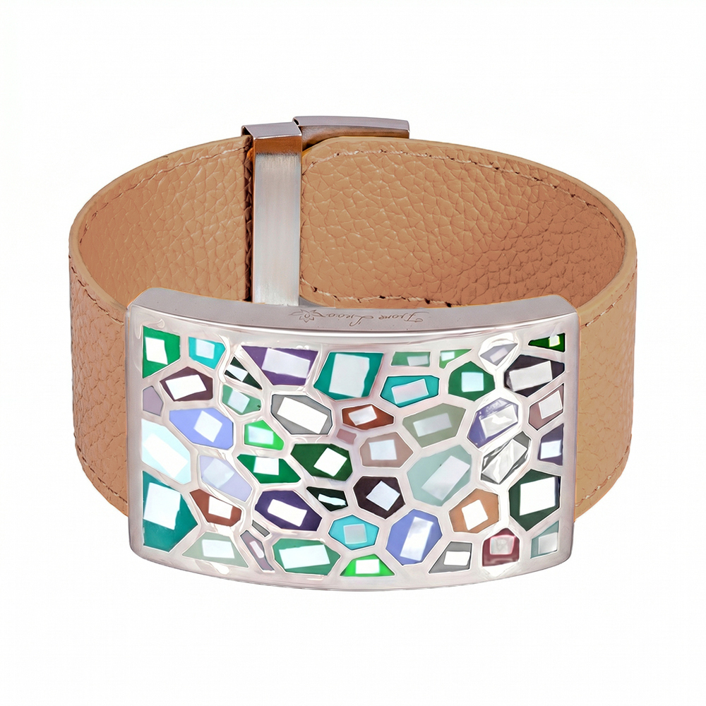Размер изделия: 23,5 см Масса изделия: 47 г размер вставки 5*3,2 см Кожаный браслет из новой коллекции Fiore Luna - это изысканный аксессуар, который идеально сочетает в себе стиль модерн и классические элементы. Изготовленный из высококачественной воловьей кожи, этот браслет не только привлекает внимание своей элегантностью, но и обеспечивает комфортное ношение благодаря приятной поверхности. Эффектная металлическая вставка, декорированная в технике холодной эмали, добавляет браслету изысканности и уникальности. Браслет оснащен удобным слэп-механизмом с магнитом и пряжкой, который позволяет регулировать размер, легко обернув вокруг запястья, а также обеспечивает комфортное и надежное закрепление аксессуара на руке. Браслет Fiore Luna станет отличным дополнением к любому образу, будь то деловой костюм или повседневная одежда. Он идеально подходит для тех, кто ценит качество, стиль и уникальность во всем.