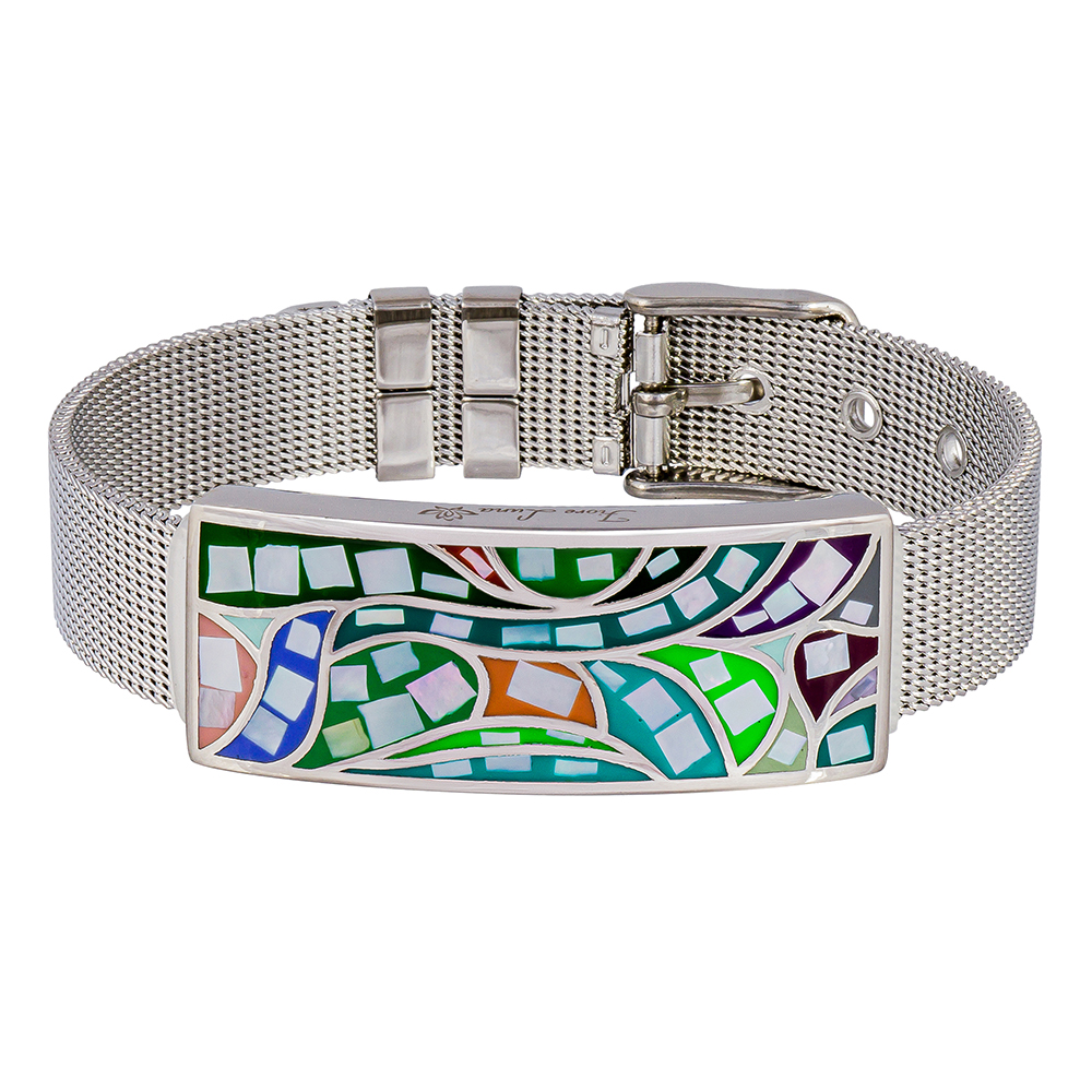 Размер изделия: 20 см Масса изделия: 29 г размер вставки 4*1,5 см Элегантный браслет на металлическом ремешке из новой коллекции Fiore Luna - это изысканный аксессуар, который идеально сочетает в себе современные и классические элементы. Изготовленный из высококачественного бижутерного сплава браслет миланского плетения отличается современным дизайном. Особое внимание привлекает подвижная вставка с фантазийным рисунком, выполненная в технике холодная эмаль с перламутром, которая добавляет браслету изысканности и уникальности. Браслет оснащен удобной застежкой, позволяющей регулировать размер, а также обеспечивать комфортное и надежное закрепление аксессуара на руке. Браслет Fiore Luna станет отличным дополнением к любому образу, будь то деловой или повседневный.