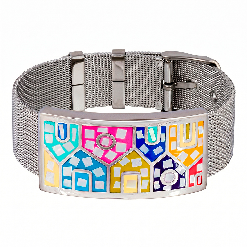 Размер изделия: 20 см Масса изделия: 44 г размер вставки 4,6*2,3 см Элегантный браслет на металлическом ремешке из новой коллекции Fiore Luna - это изысканный аксессуар, который идеально сочетает в себе современные и классические элементы. Изготовленный из высококачественного бижутерного сплава браслет миланского плетения отличается современным дизайном. Особое внимание привлекает подвижная вставка с фантазийным рисунком, выполненная в технике холодная эмаль с перламутром, которая добавляет браслету изысканности и уникальности. Браслет оснащен удобной застежкой, позволяющей регулировать размер, а также обеспечивать комфортное и надежное закрепление аксессуара на руке. Браслет Fiore Luna станет отличным дополнением к любому образу, будь то деловой или повседневный.
