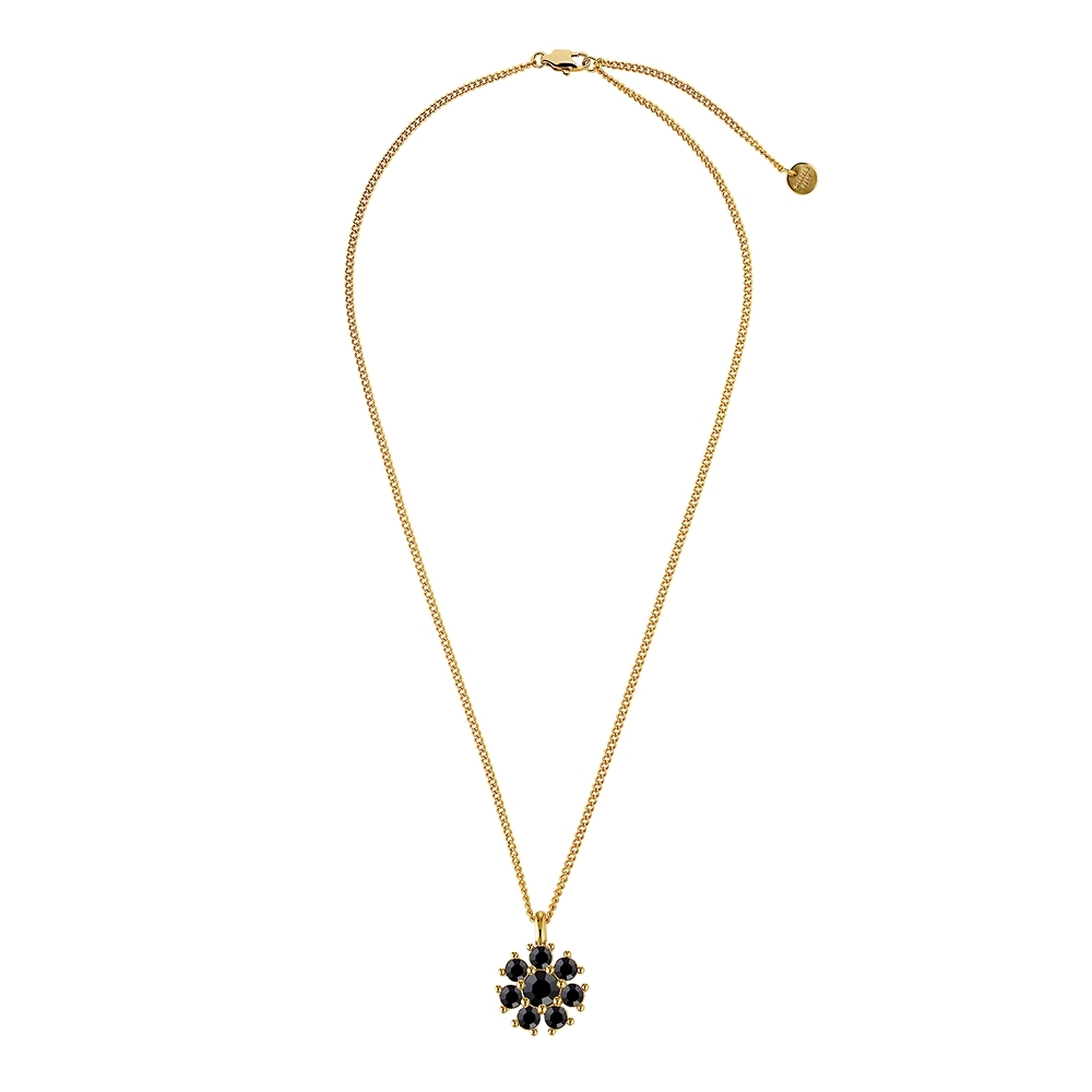 Размер изделия: 42 см + 5 см удлинитель Масса изделия: 10 г DELISE — романтическая цепочка в стиле ретро из нержавеющей стали, украшенная подвеской с цветочным узором из сверкающих кристаллов. Диаметр подвески — 18 мм. Прекрасно смотрится как с простой рубашкой, так и с вечерним платьем. Представлена в варианте с полностью черными кристаллами на золотистой основе. Протестировано на аллергию и разработано в Дании