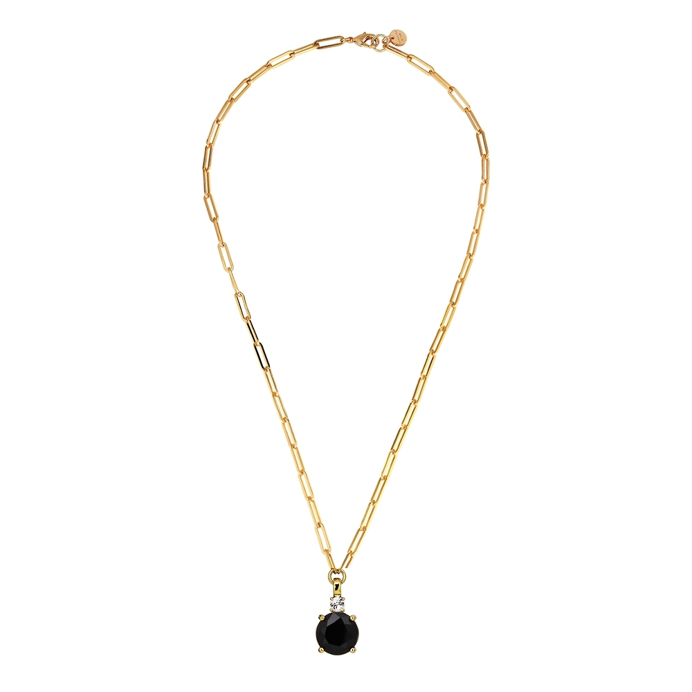 Размер изделия: 80 см Масса изделия: 25 г GLORY — красивая классическая цепочка из нержавеющей стали, украшенная крупным кристаллом диаметром 15 мм в классической оправе. Здесь представлена наша любимая классическая версия с черным кристаллом на золотой основе. Выполнена из полированной латуни компанией DYRBERG KERN и выглядит просто потрясающе. ДАТСКИЙ ДИЗАЙН.