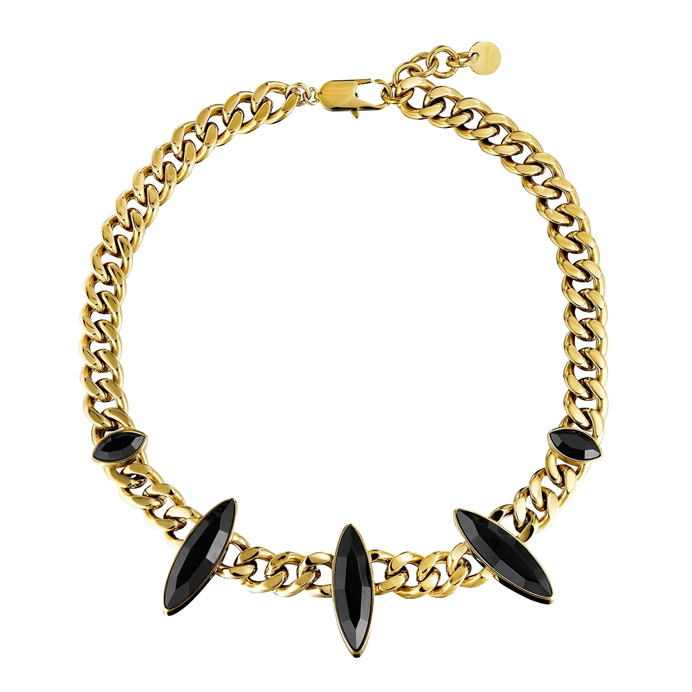 Размер изделия: 45 + 5 см удлинитель Масса изделия: 150 г OPSICA — это массивное короткое колье, которое красиво ложится на шею. Привлекает внимание и в то же время выглядит очень шикарно! Цепочка выполнена из полированной стали, а пять крупных и мелких кристаллов в форме листьев потрясающе красивы. Носите OPSICA с простым топом или вечерним платьем — как вам больше нравится. Здесь представлена версия в золотистых тонах с эффектными угольно-черными камнями. ДАТСКИЙ ДИЗАЙН — без кадмия, свинца и никеля.