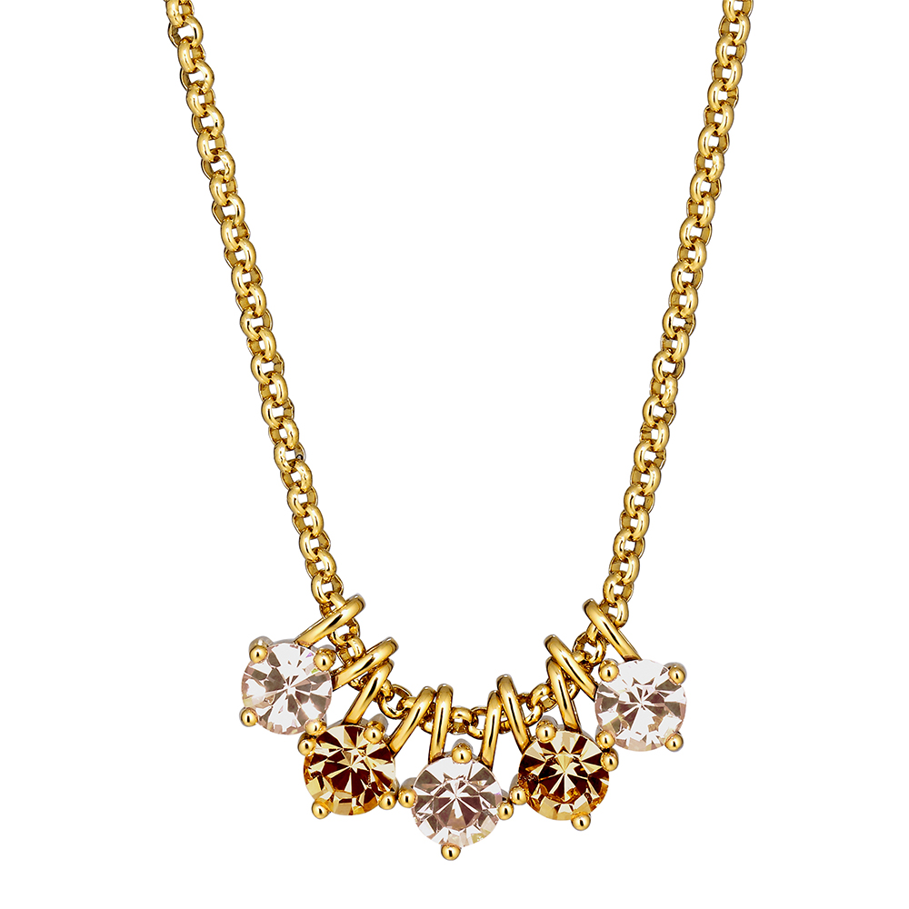 Размер изделия:42 + 5 см удлинитель Масса изделия: 10 г PHILA — элегантная цепочка с пятью подвесками в виде кристаллов фацетной огранки. Цепочка изготовлена из нержавеющей стали, подвески — из полированной латуни. Здесь представлена в золотистой отделке с золотистыми кристаллами. Датский дизайн без никеля.