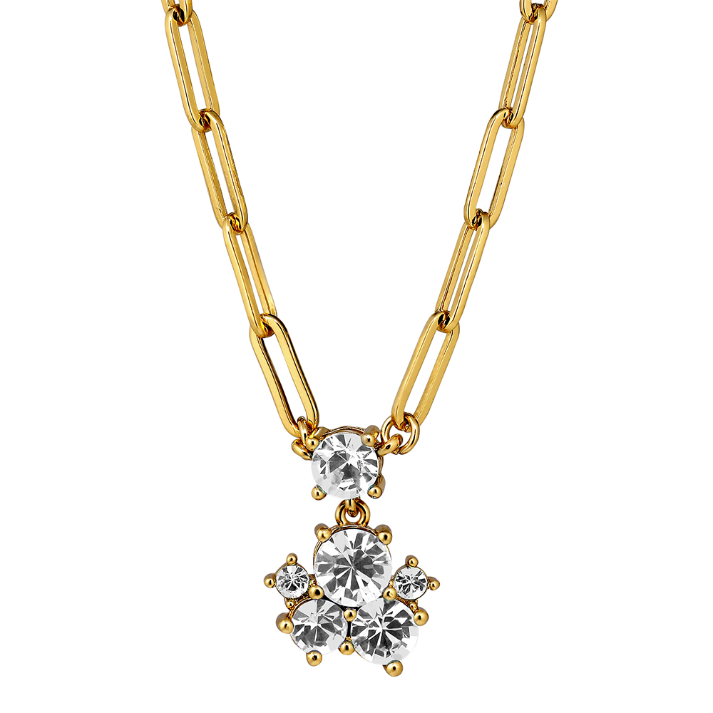 Размер изделия:45 + 5 см удлинитель Масса изделия: 15 г TANZY — элегантная цепочка с подвеской из множества кристаллов разного размера. Цепочка изготовлена из нержавеющей стали, подвески — из полированной латуни. Представлена в золотистой отделке с белыми кристаллами. Датский дизайн без никеля.