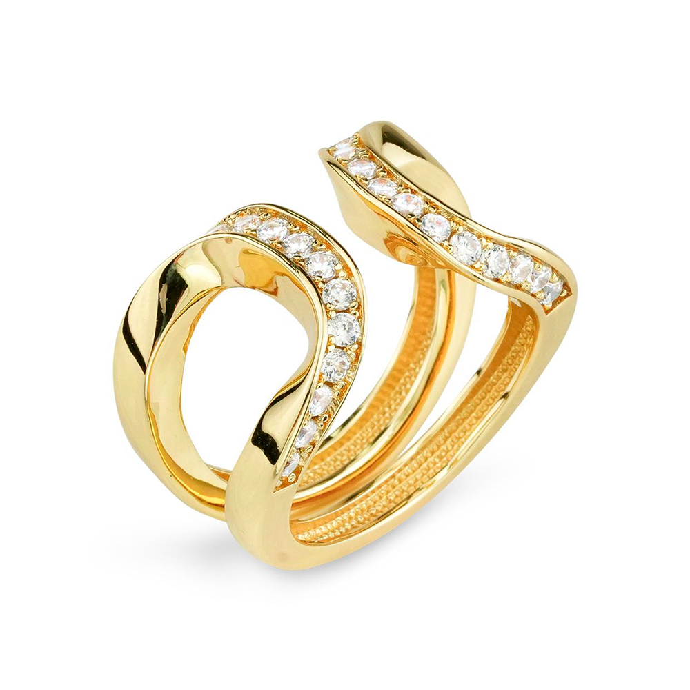 Размер изделия: безразмерное Масса изделия: 9 г бронза, покрытие золотом, кубический цирконий Открытое кольцо с двумя позолоченными желтыми ободками и рядами фианитов.
