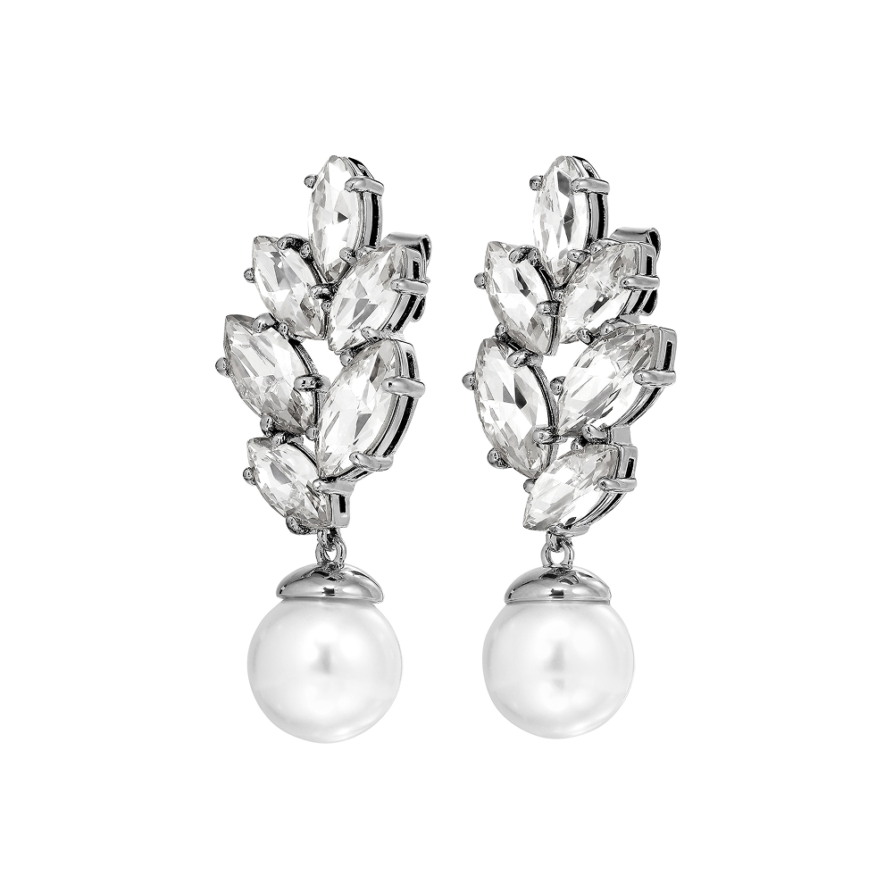 Размер изделия: 4 см Масса изделия: 7,5 г BALETE — это красивые, женственные и элегантные серьги, которые отлично подойдут для торжественных мероприятий и вечерних выходов. Верхняя часть полностью усыпана белыми кристаллами в форме листьев и украшена имитацией белого жемчуга диаметром 10 мм. Украшение выполнено из полированной латуни со штифтом из хирургической стали. Ручная работа. Не содержит никеля, датский дизайн.