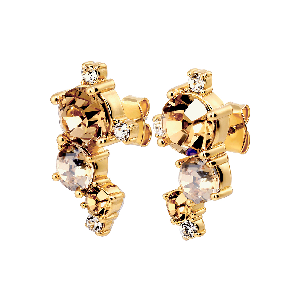 Размер изделия:2,2 см Масса изделия: 2 г CURRA — элегантные и необычные серьги-гвоздики с множеством круглых кристаллов разных размеров фацетной огранки, расположенных в асимметричном узоре. Необычный, но классический дизайн. Можно носить отдельно или с серьгой-гвоздиком меньшего размера во втором проколе. Здесь представлены в золотистых цветах и с золотистой отделкой. Датский дизайн — не содержит кадмия, свинца и никеля.