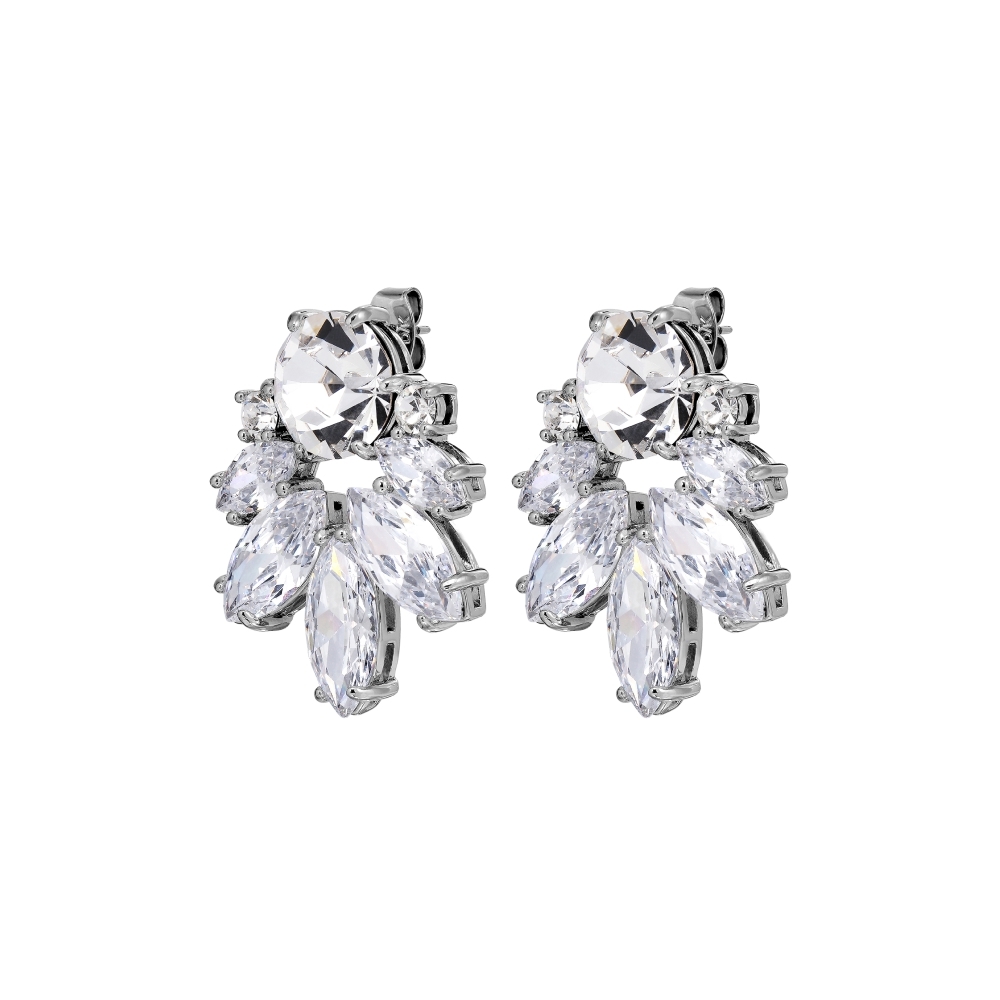 Размер изделия: 3 см Масса изделия: 7,7 г DRAGO — это привлекательные и элегантные серьги, состоящие из полукруга кристаллов в форме листьев, собранных вокруг более крупного круглого камня контрастного цвета. Здесь представлены классические белые кристаллы на серебристой основе. Застежка из хирургической стали.