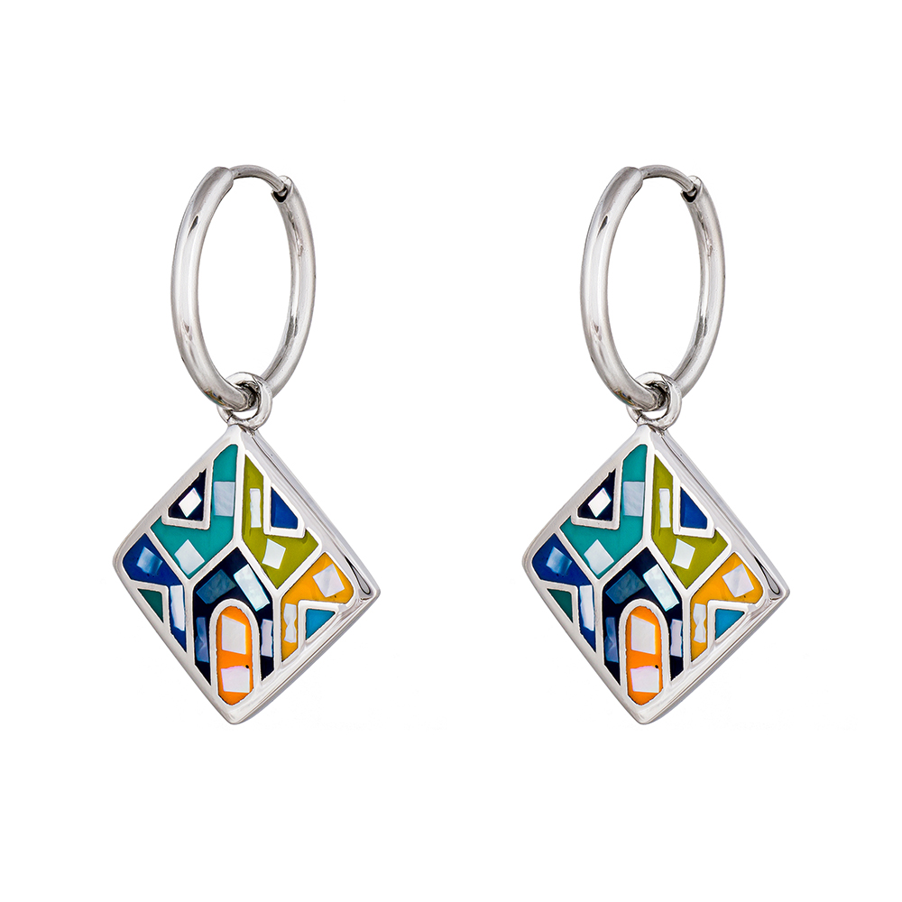 Размер изделия: 3,4 см Масса изделия: 3 г диаметр кольца 1,5 см; размер подвески 1,8*1,8 см Элегантные серьги от бренда Fiore Luna предлагают новое прочтение стиля ар-деко. Сережки с массивными подвесками дополнят любой образ и, несомненно, привлекут всеобщее внимание благодаря лаконичному дизайну и подвескам, декорированым эмалью. Комфортные застежки надежно фиксируют их на ушах. Лёгкие, стильные и универсальные, эти серьги прекрасно дополнят как повседневный, так и праздничный образ.