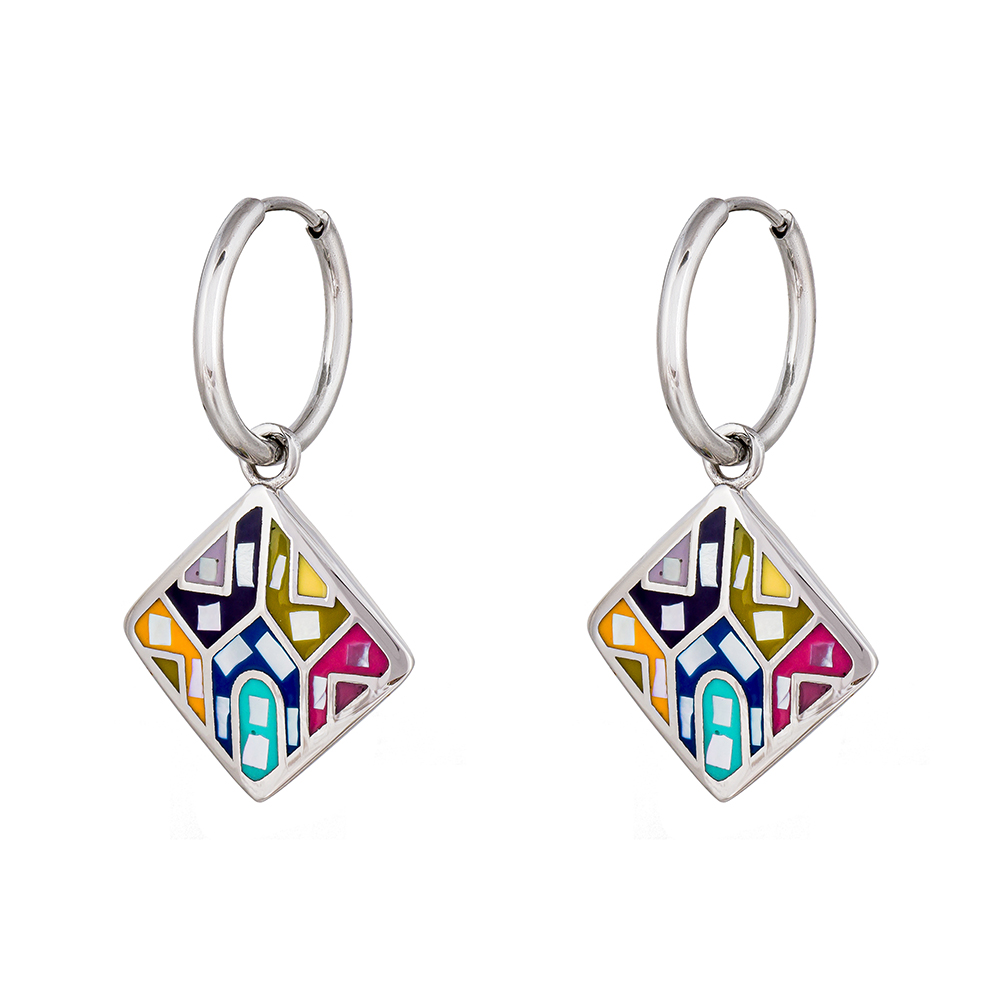 Размер изделия: 3,4 см Масса изделия: 3 г диаметр кольца 1,5 см; размер подвески 1,8*1,8 см Элегантные серьги от бренда Fiore Luna предлагают новое прочтение стиля ар-деко. Сережки с массивными подвесками дополнят любой образ и, несомненно, привлекут всеобщее внимание благодаря лаконичному дизайну и подвескам, декорированым эмалью. Комфортные застежки надежно фиксируют их на ушах. Лёгкие, стильные и универсальные, эти серьги прекрасно дополнят как повседневный, так и праздничный образ.