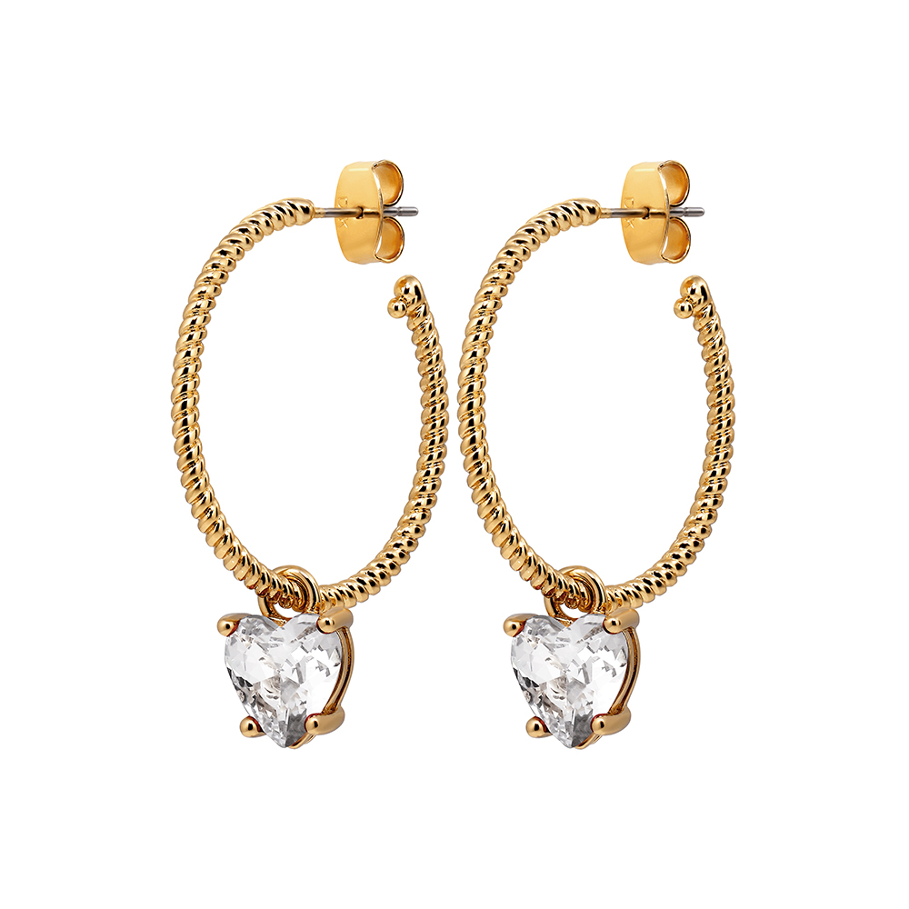 Размер изделия:2,6 см Масса изделия: 2 г ELANA — красивые кольца с подвеской в виде сердца из граненого кристалла. Подвеска диаметром 8 мм. Здесь представлена в блестящем золотом цвете с белыми кристаллами. Датский дизайн ручной работы без использования никеля.