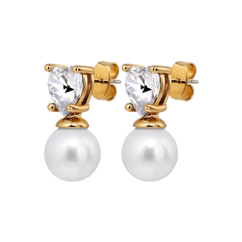 Размер изделия:2 см Масса изделия: 2 г EMO — шикарные маленькие сережки-гвоздики с подвеской в виде кристалла в форме сердца, увенчанного круглой белой искусственной жемчужиной. Корпус из полированной латуни, гвоздик из хирургической стали. Представлены в золотистой отделке с белыми кристаллами. Датский дизайн без никеля.