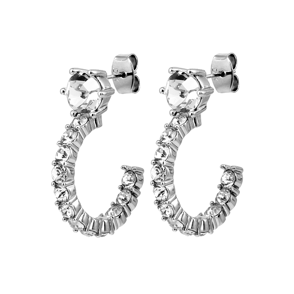 Размер изделия:2,8 см Масса изделия: 4 г ESPRIT — это новый взгляд на классические серьги-кольца: над кольцом диаметром 22 мм расположен округлый кристалл, богато украшенный кристаллами с многогранной огранкой. Общая длина около 28 мм. Отлично подойдут для вечернего выхода или любого другого случая, когда хочется блистать. Корпус из полированной латуни, штифт из хирургической нержавеющей стали. Здесь представлено сочетание белых кристаллов с серебристой отделкой. Датский дизайн — не содержит кадмия, свинца и никеля.