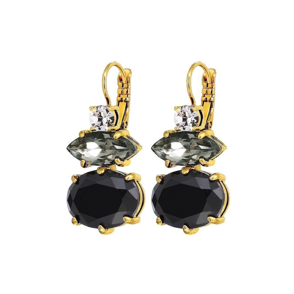 Размер изделия: 3 см Масса изделия: 7 г PARSANA — это декоративные женские серьги с закрытой застёжкой из хирургической стали. Три гранёных кристалла создают красивую игру цвета, в данном случае — таинственное сочетание чёрного, серого и белого оттенков на золотистой основе. Дизайн выполнен в Дании и, конечно же, не содержит никеля