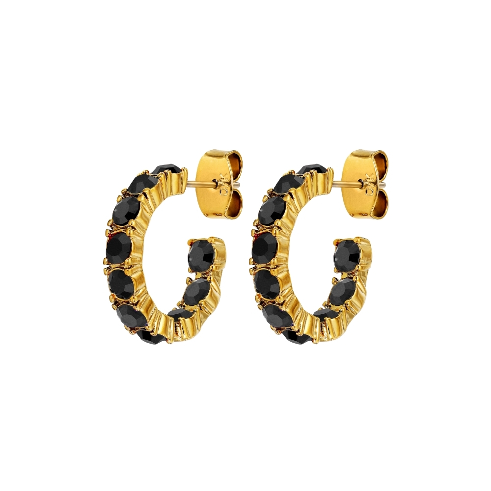 Размер изделия: 1,8 см Масса изделия: 2 г RAQUEL — богато украшенные хрустальные серьги-кольца. Обратите внимание на крепление кристаллов спереди и сзади. Стержень изготовлен из хирургической стали. Здесь представлено красивое сочетание угольно-черных кристаллов с золотистой отделкой. Датский дизайн без никеля. Не содержит кадмия, свинца и никеля. Шикарные маленькие штучки...